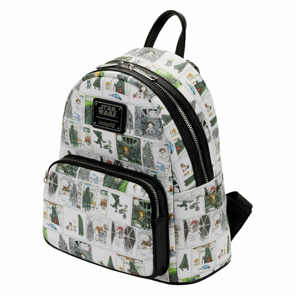 Parenthood is a galactic responsibility. The Loungefly Darth Vader Comic Strip Mini Backpack displays an all-over print of Darth Vader with a young Luke and Leia. Featuring artwork by Jeffery Brown, these comic book-style panels imagine endearing scenarios of Darth Vader as he experiences the everyday challenge of raising two of the galaxy’s finest heroes. Darth Vader’s mask appears as an enamel zipper charm for a dose of added fun. This playful accessory adds a spark of joy to any outfit and is sure to uplift your Star Wars collection.