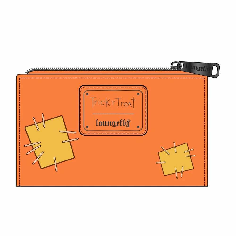 The Loungefly Trick ‘r Treat Sam Cosplay Flap Wallet is made of vegan leather (polyurethane). Wallet zips and snaps closed, has sturdy gunmetal hardware, and features printed, burlap, and embroidered details. Take note of the coordinating pattern of the inside lining fabric.