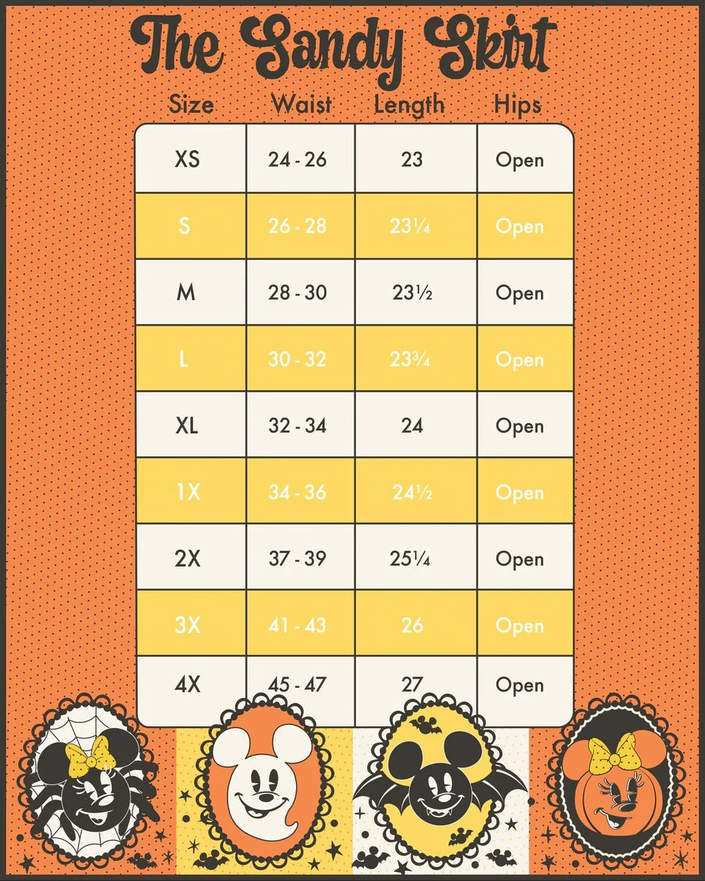 This Sandy style skirt is made of super soft stretch sateen (97% cotton/3% spandex). Hitting just at the knee on most, the Disney Mickey and Minnie Halloween Sandy Skirt features a zipper back, pockets, elastic waist band (for extra comfort), and a button closure. This versatile skirt can easily be paired with tees, blouses, sweaters, and more to dress it up or down.
