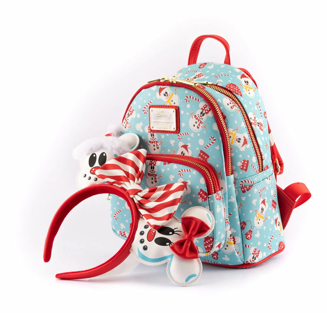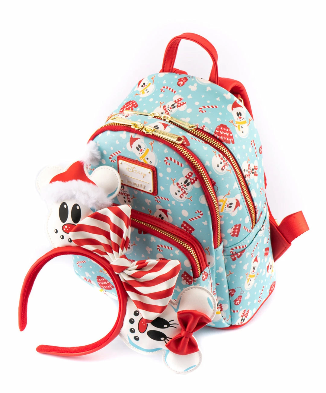 Let it snow, let it snow, let it snow with the Loungefly Disney Snowman Mickey and Minnie Mouse Mini Backpack with Ears Headband. This cool mini backpack design features Mickey and Minnie Mouse as snow sculptures along with Mickey ears shaped snowflakes, sweaters, candy canes, mittens, and pom pom topped hats. The pattern on the Disney Ears headband features Mickey Mouse and Minnie Mouse as snow sculptures topped with a holiday hat and red bow respectively, while the center bow is striped like a classic candy cane. The backpack even has front holder specifically for carrying your headband. This spectacularly snowy set is the perfect finishing touch to a Disney winter wardrobe.