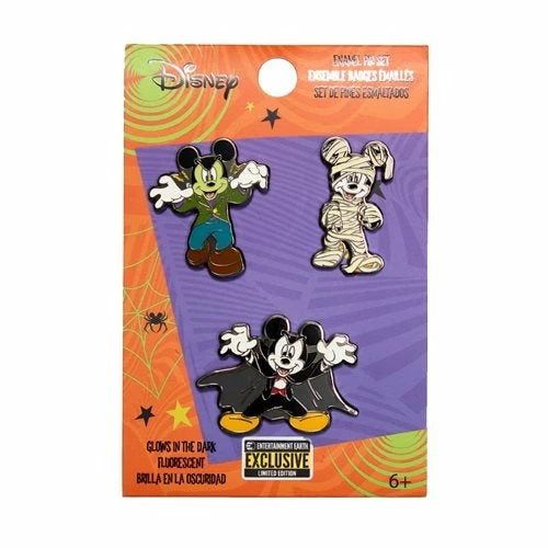 - Each set includes 3 pins – Mummy, Vampire, and Frankenstein Mickey.