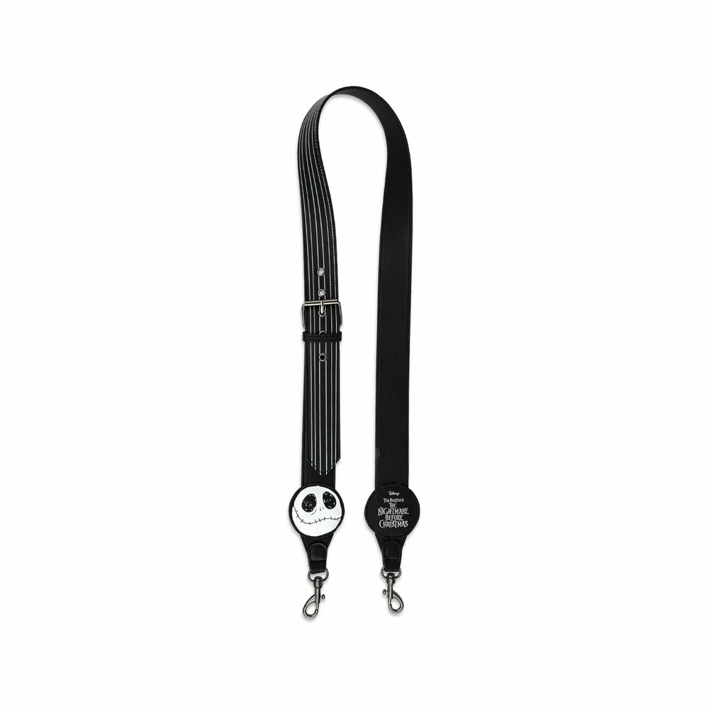 The Disney Jack Skellington Head Bag Strap is made of vegan leather (polyurethane). Strap has sturdy metal hardware, swivel clasps, appliques, and printed details.