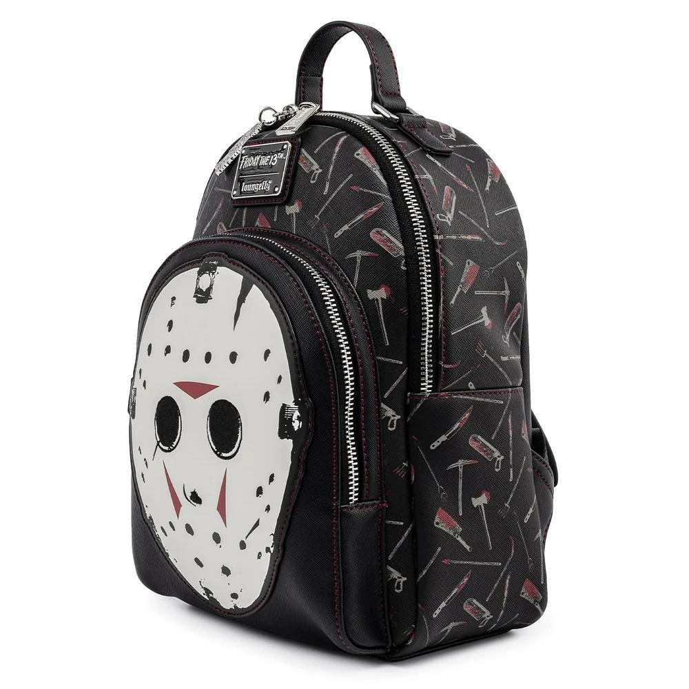No need to wait for Friday the 13th! The Loungefly Friday the 13th Jason Mask Mini Backpack is here to put the fear in your collection. The background pattern features an assortment of weapons. On the front and center is Jason’s hockey mask which glows in the dark. It’s a striking design making it an appealing accessory for Halloween-themed outfits.