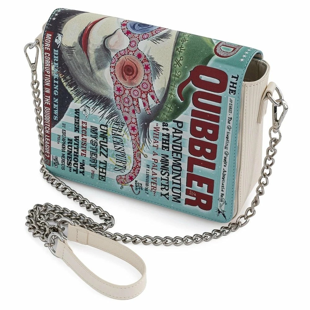 The Loungefly Harry Potter Quibbler Crossbody Bag is made of vegan leather (polyurethane). Bag has a detachable chain shoulder strap, sturdy metal hardware, and features: applique, debossed, and printed details. Take note of the coordinating pattern of the inside lining fabric.