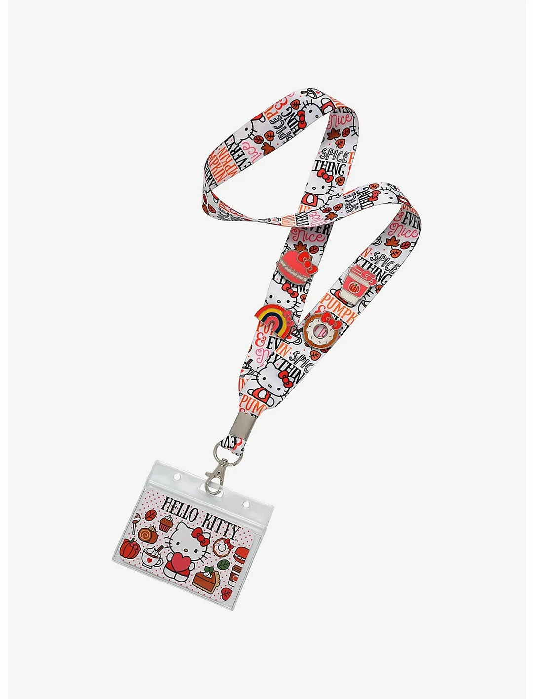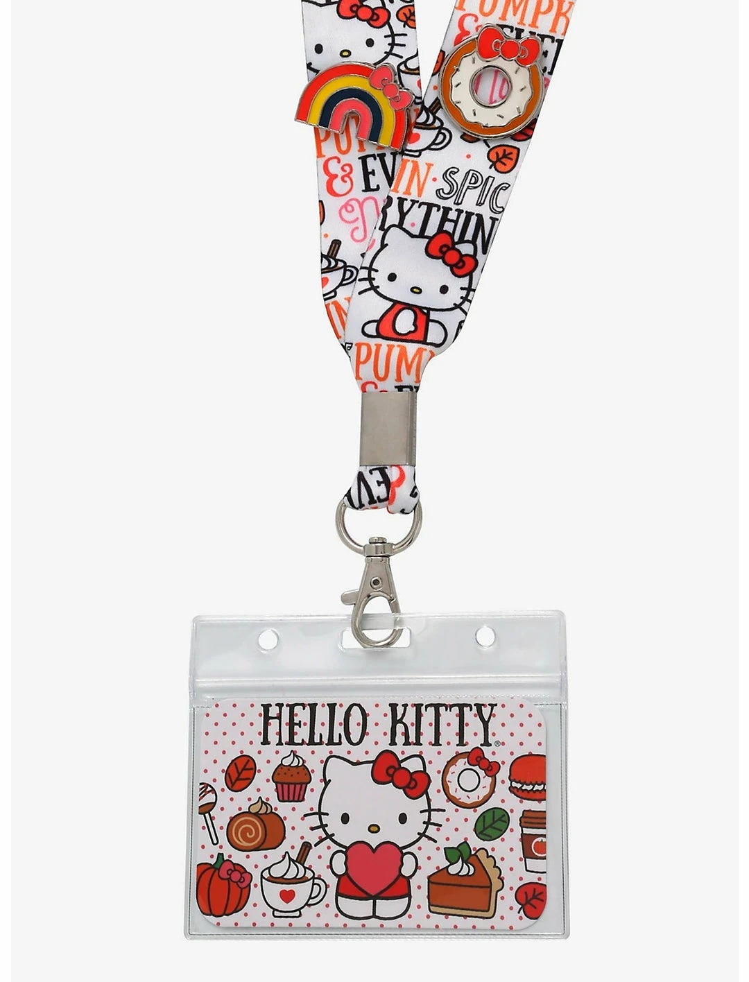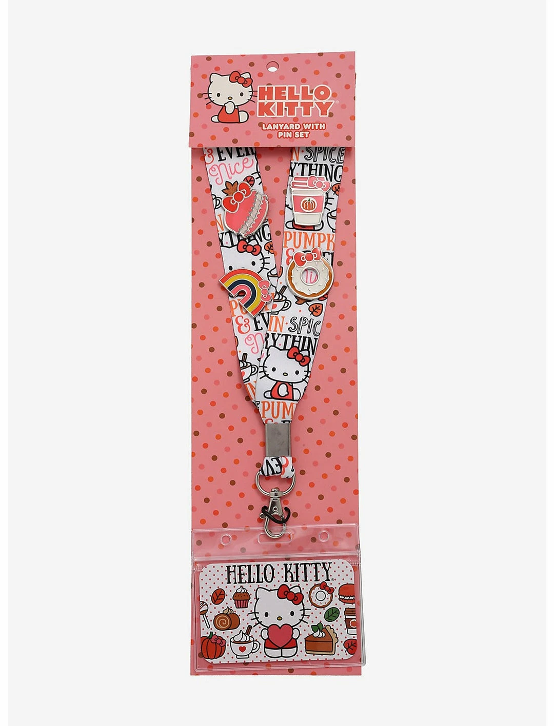 Pumpkin spice, everything nice! This Hello Kitty lanyard includes four enamel pins: pumpkin spice latte, donut, macaron and rainbow.