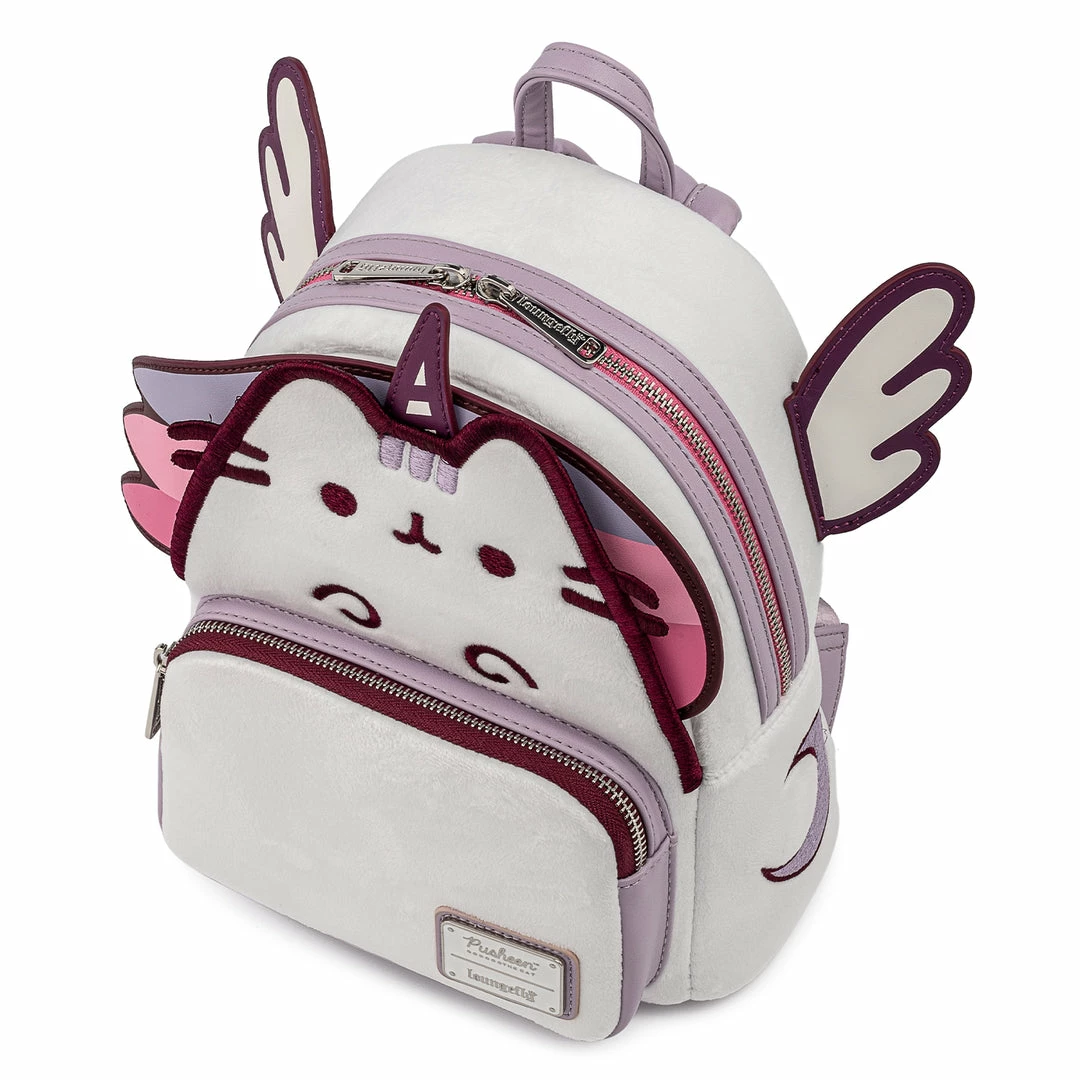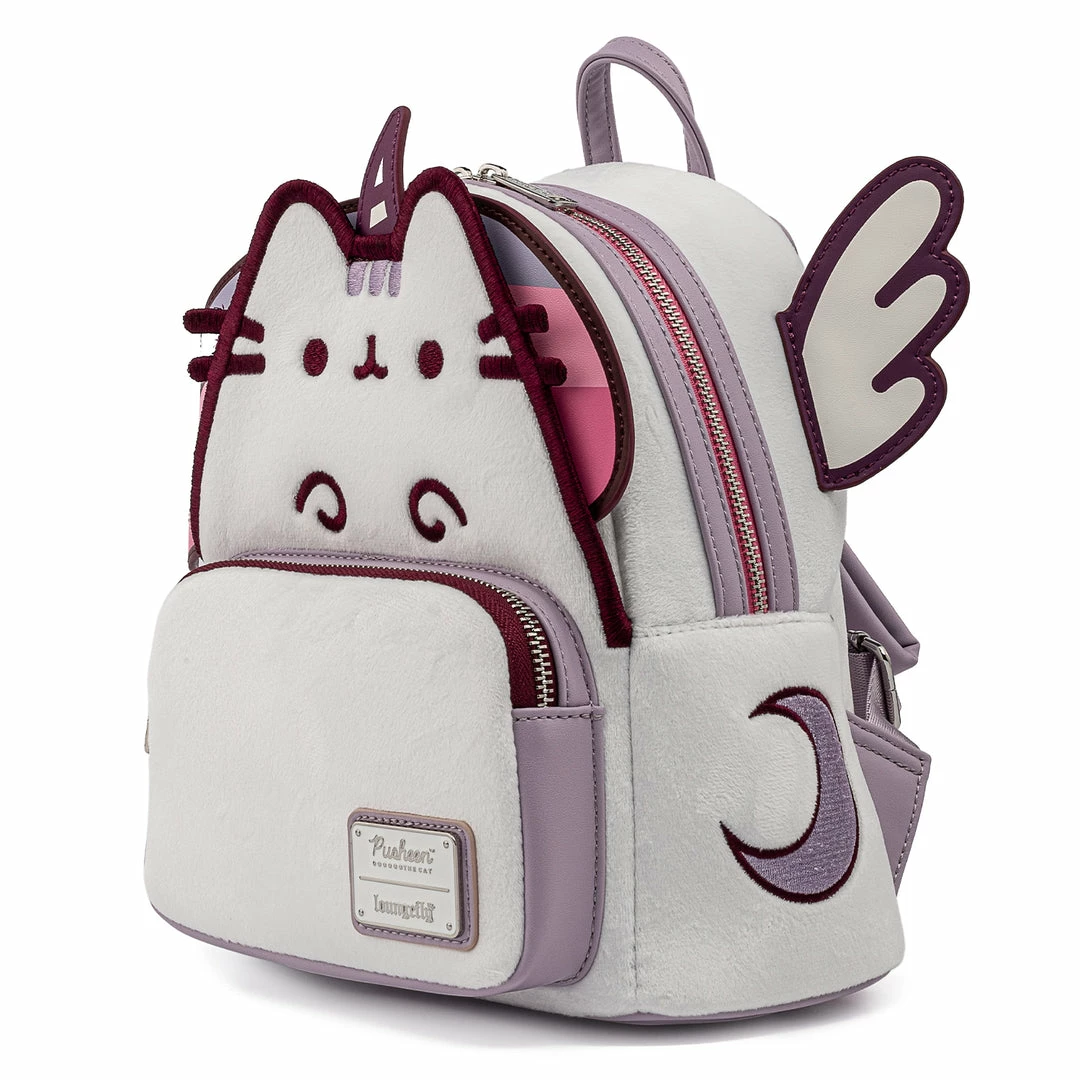 The Super Pusheenicorn Plush Mini Backpack is made of plush and vegan leather (polyurethane) trim. Bag has adjustable shoulder straps, sturdy metal hardware, and features: faux leather tail, applique, embroidered, and glitter zipper pull details. Take note of the coordinating pattern of the inside lining fabric.
