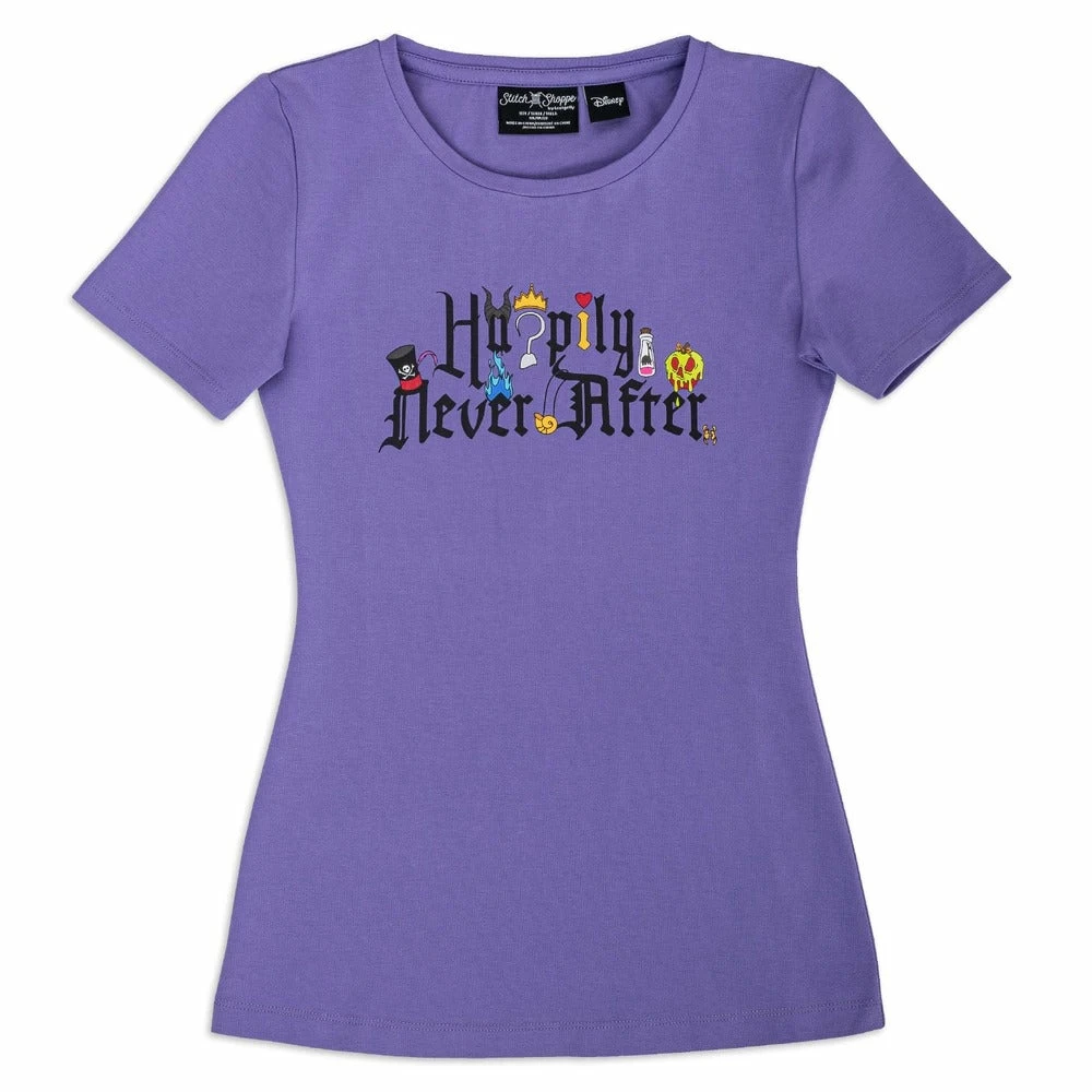 Pay homage to your favorite Disney villains by wearing the Stitch Shoppe by Loungefly Disney Villains Books “Ariana” Top. The design printed on the center front of this soft jersey shirt features objects referencing various villains and reads “Happily Never After”.